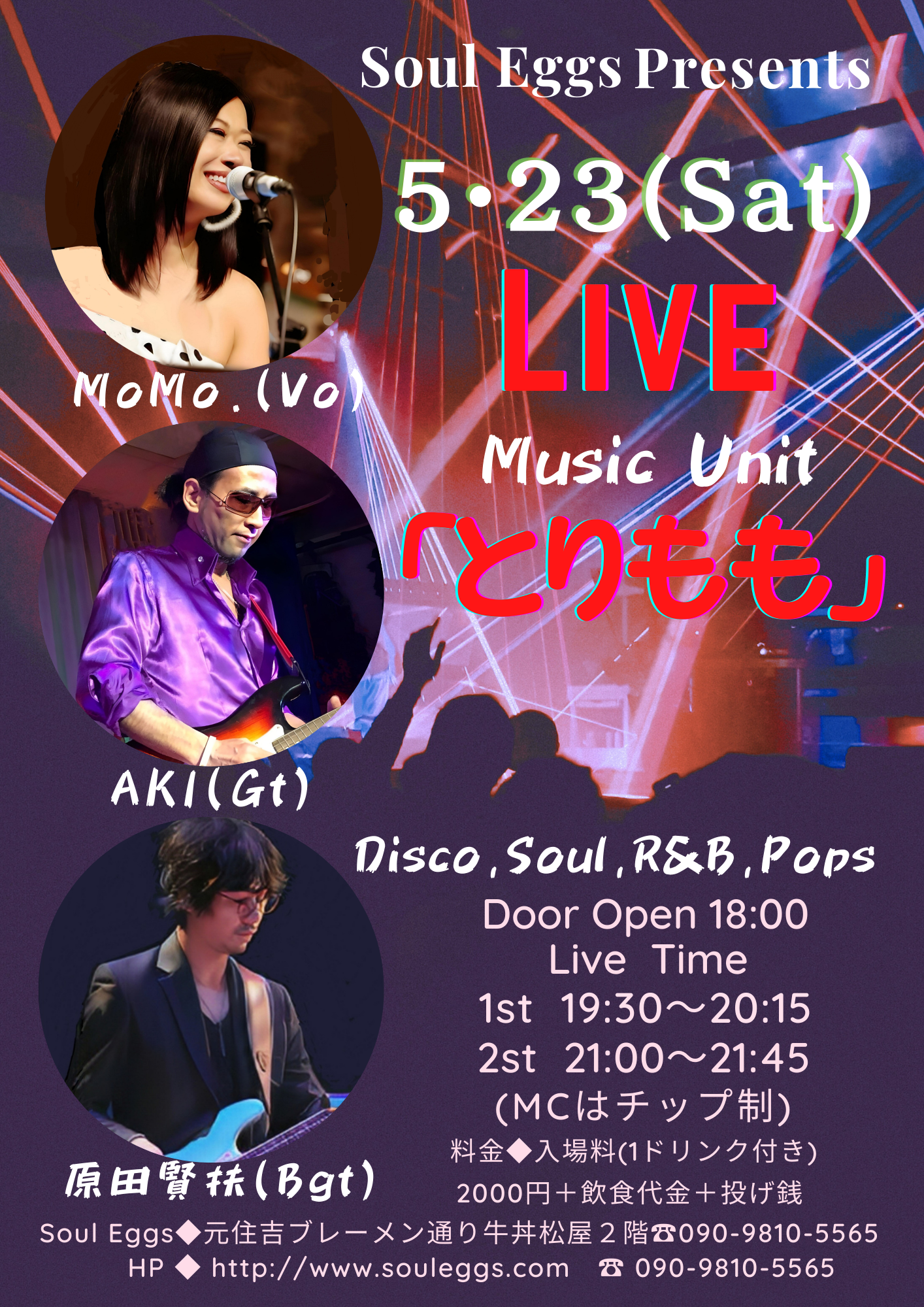 素晴らしい歌唱力の「MoMo.」と、抜群なテクニックでクールな演奏の「AKI」&「ケンケン」の目の前でのライヴをお楽しみ下さいませ。❗